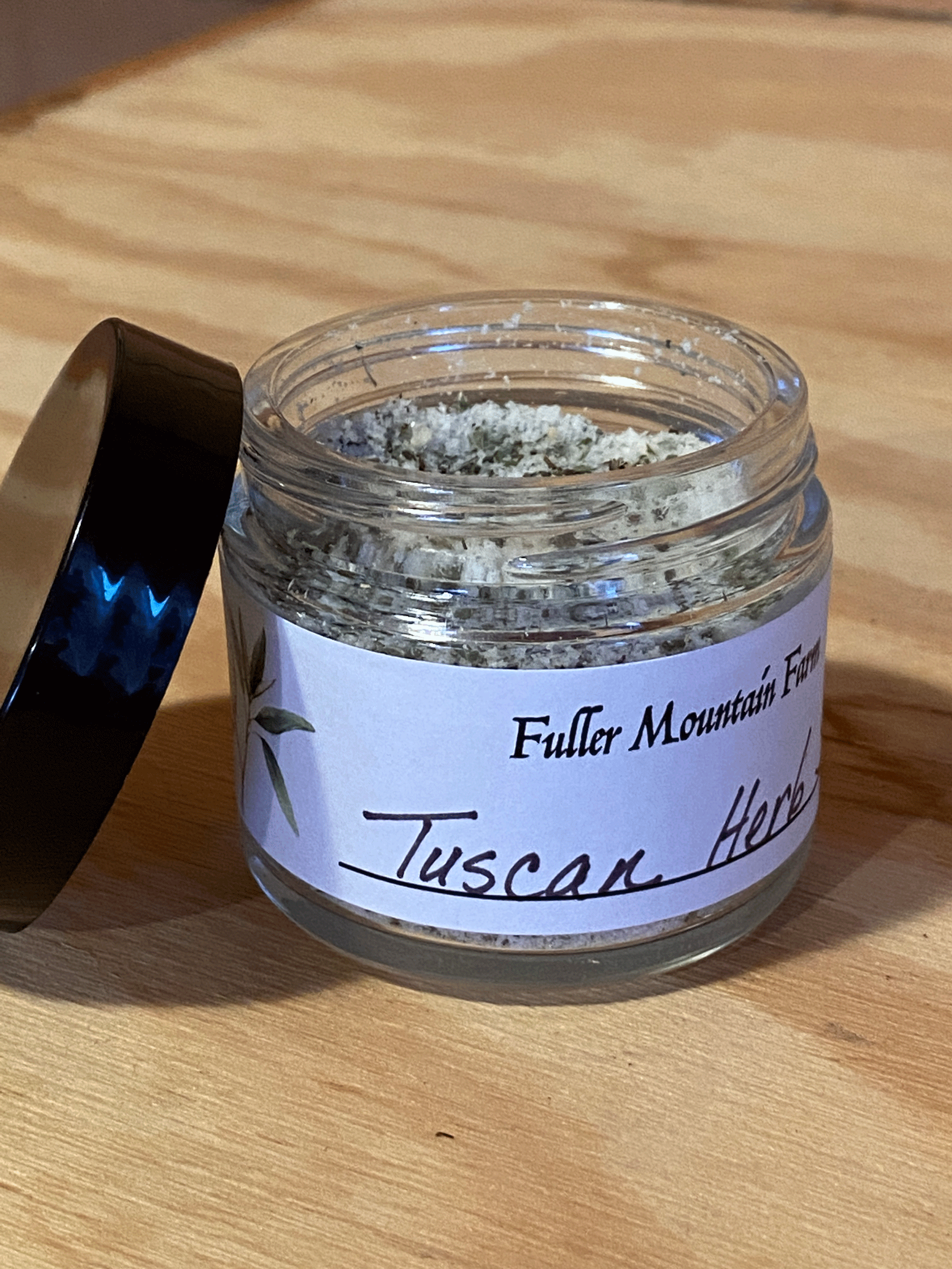 Tuscan Herb Salt - Capturing the flavors of Tuscany, this is a blend of farm-grown herbs - rosemary, sage, garlic, basil, oregano - and coarse sea salt. Delicious on grilled or steamed vegetables, meat, and fish. Mixed with olive oil, it makes a delicious bread dip.