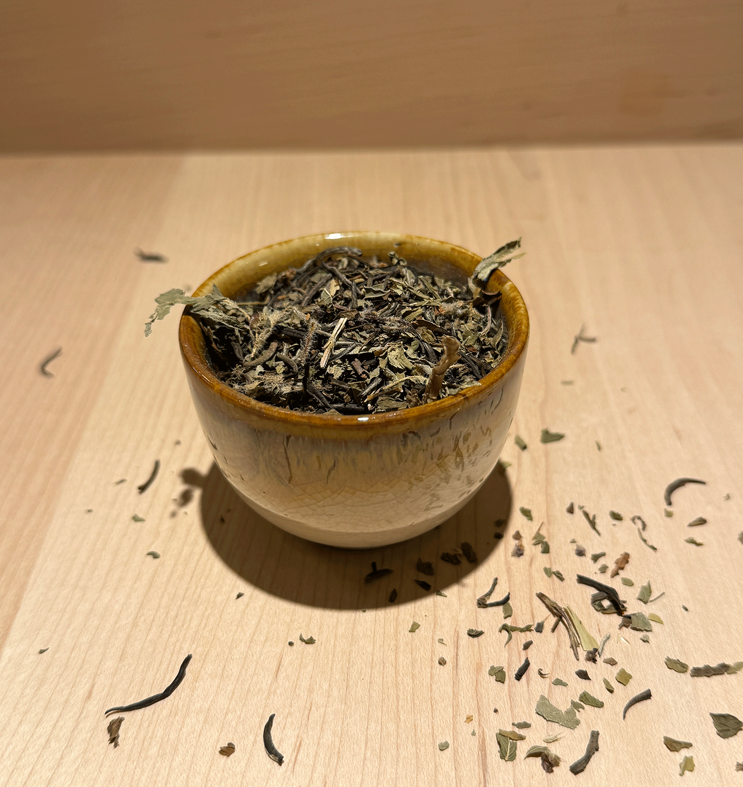 Good Mood Tea: Farm-grown Tulsi, farm-grown lemon balm, organic oat straw. Sustainably grown on our Vermont farm. Caffeine free.